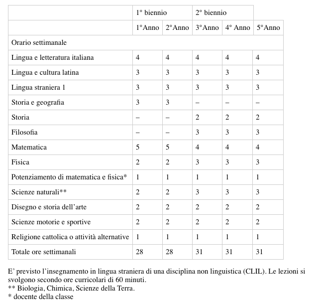 Secondo le indicazioni della riforma (DPR 89/2010) il percorso del liceo scientifico è indirizzato allo studio del nesso tra cultura scientifica e tradizione umanistica, pertanto il Piano di Studi armonizza l’approfondimento rigoroso del sapere matematico e scientifico con un’ampia preparazione nelle discipline umanistiche. L’obiettivo è di offrire, al termine del ciclo di studi e della pratica laboratoriale, una formazione culturale completa, aperta alla pluralità dei linguaggi, che consenta di accedere a ogni tipo di indirizzo universitario. Una visione storico-critica e una conoscenza del contesto storico e filosofico in cui le discipline si sono sviluppate è un altro obiettivo importante per capire che la scienza ha progredito grazie agli sforzi e alle intuizioni di uomini e donne appassionati del loro lavoro. L’ambiente multimediale si presta molto bene per supportare lo studio e gli approfondimenti delle discipline scientifiche e permette di utilizzare programmi opportuni per verificare, rielaborare e consolidare ciò che si è imparato.